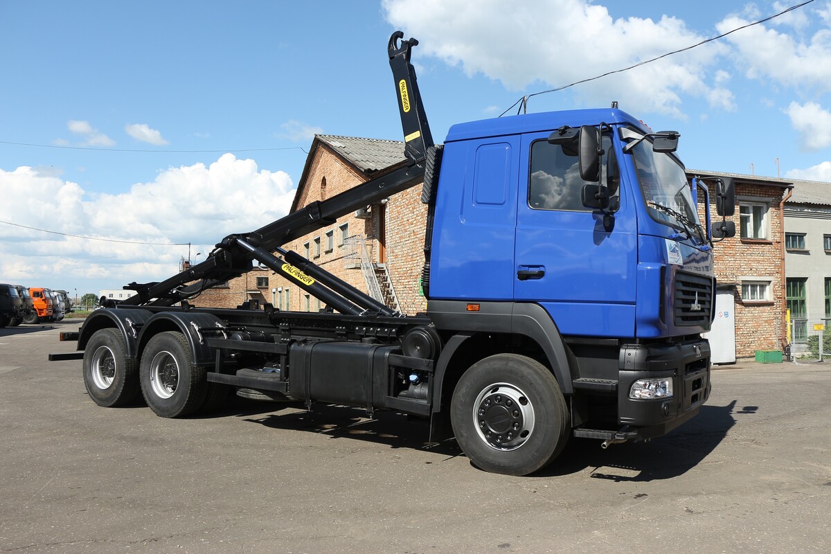 Базовое шасси МАЗ 631228-8575-012 (Евро-5) Колесная формула 6х4 Модель двигателя Weichai Power (430 л.с.) Модель КПП Fast Gear (12 ступенчатая) Модель системы крюкового захвата Palfinger Т20 Грузоподъемность    20000 кг Максимальный угол подъема     48 град. Допустимая длина контейнера    7000 мм Время погрузки/ опрокидывания кузова    44/49 с Рабочее давление гидравлической системы    315 бар